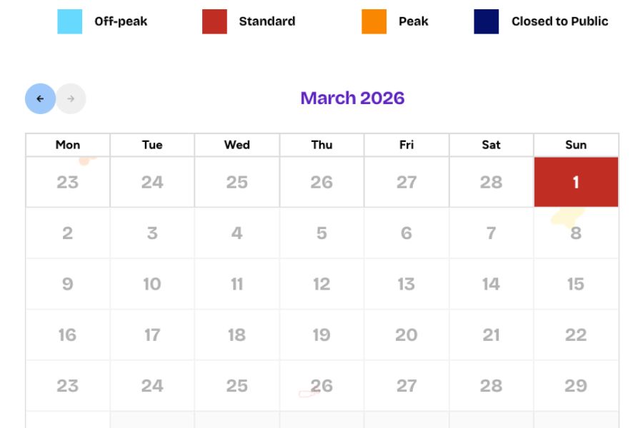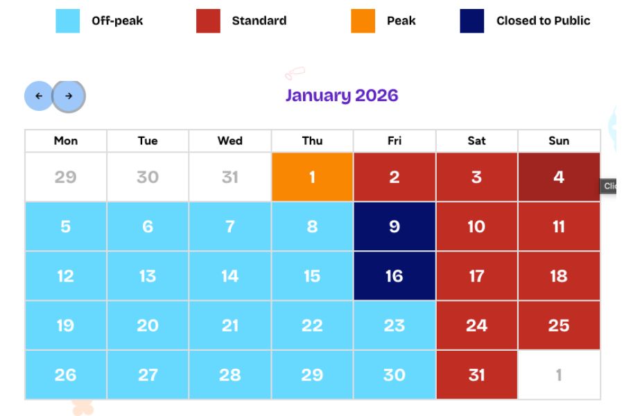Ticket prices vary based on whether you buy them for Standard, Off-Peak, or Peak Days in the Adults or Concession (children aged 3-11) categories. Each online ticket also comes with a specific number of tokens that are loaded onto a card you can use for rides and games, depending on which category you buy.