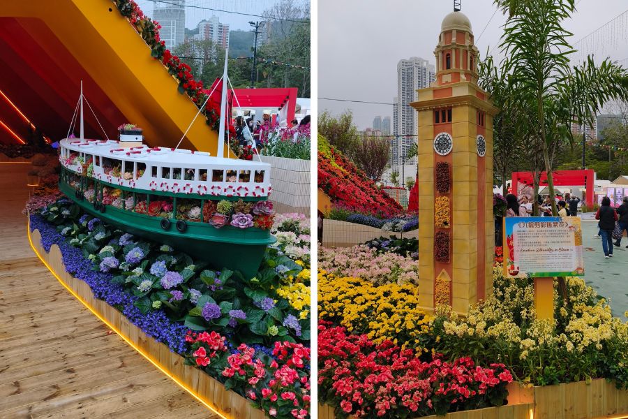 Hong Kong’s harbour heritage also gets a nod through a Star Ferry-inspired floral build and a Clock Tower-style landmark, both designed as walk-up viewing points where visitors tend to pause for photos.